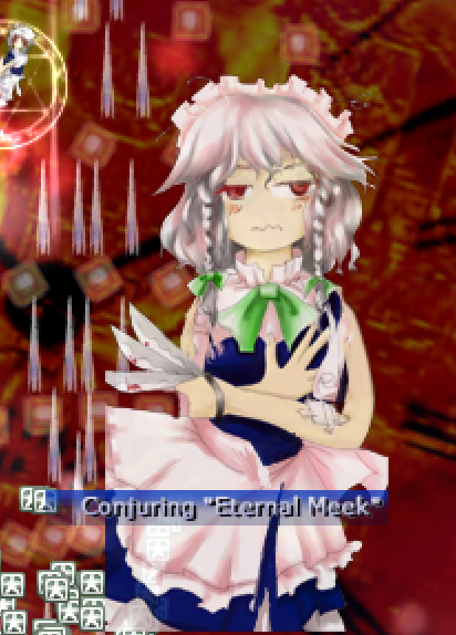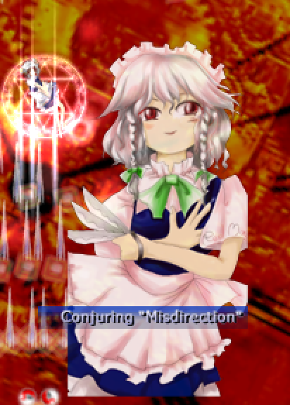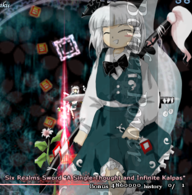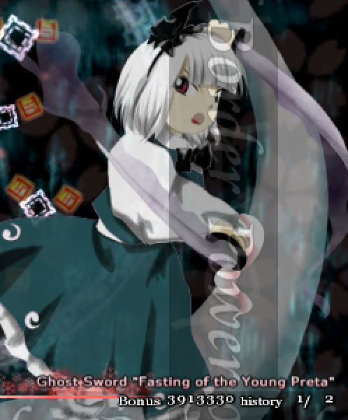 One of my new favourite details: in Embodiment Of Scarlet Devil, Sakuya's spell card splash portrait in stage 5 is replaced with an uglier, angrier portrait when she returns in stage 6. This detail reappears in Perfect Cherry Blossom with Youmu, but the situation is reversed.
