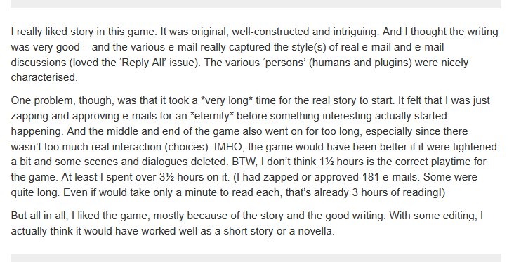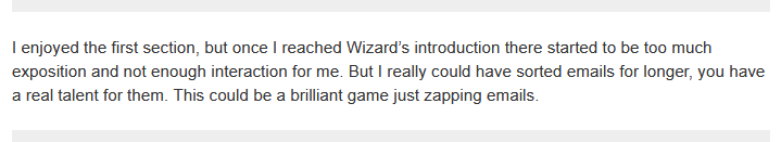 If I had to say what the most obvious stylistic flaw in "You are SpamZapper 3.1" (A NEW GAME BY ME THAT'S HERE FOR FREE https://ifcomp.org/ballot#entry-2529) is that I unwittingly penned myself into a writing style where I couldn't really do cutaways or scene breaks.