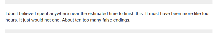 I understand this feeling exactly… and now I'm imagining the addition of a sidebar button labeled "Are We There Yet?" that, when clicked, simply tells you how many more passages remain until the end – a significant yet practical spoiler that you have to explicitly opt into.