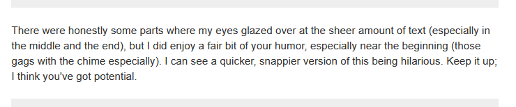 I appreciate comments suggesting ways to improve it, such as this. While I won't change or continue it (beyond bugfixes) because I don't like remakes or sequels, knowing how a work MIGHT be adjusted still provides a telling glimpse at what parts of my craft are valued, and why.