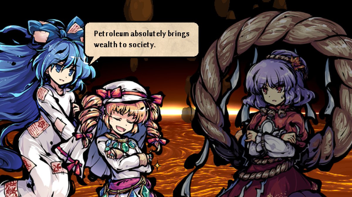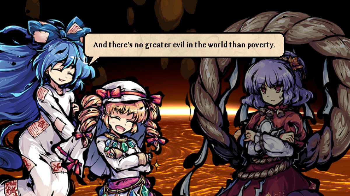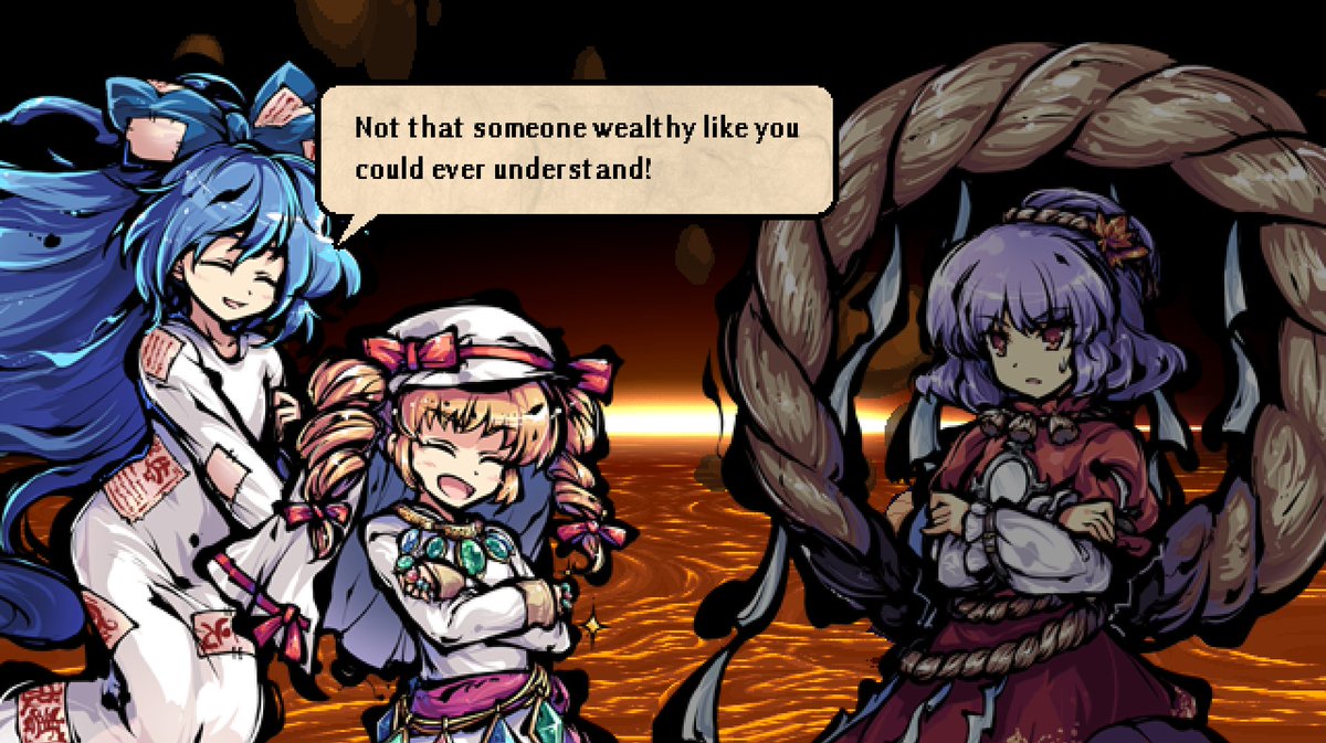 Some may think it's a bit lazy of ZUN that both Shinmyoumaru and Shion, after a dramatic break with their respective bad exes, end up back with them a few games/books later as if nothing happen. But you see, the common thread is Tenshi. This is what dating Tenshi does to people.
