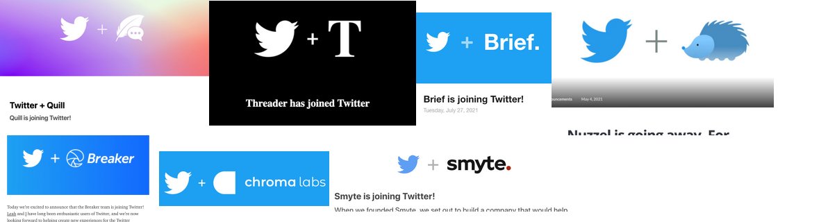 Was reading https://ourincrediblejourney.tumblr.com/ and noticing how every Twitter acquisition has the same "bird + logo" header structure, heavily implying Twitter enforces a specific branding format for just acquisition announcements.
