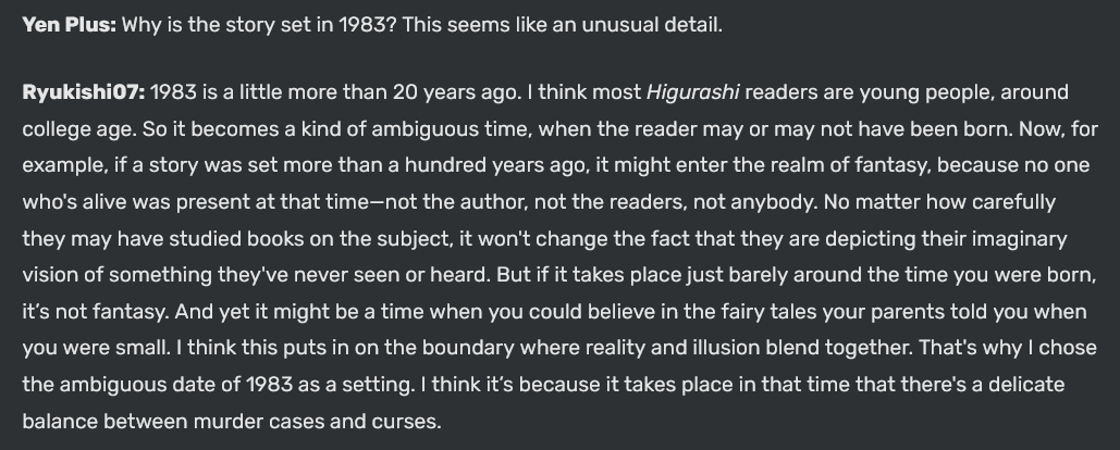 I really love this interview explanation for why the When They Cry games take place in the 80s – specifically because for millennials, it's both "the modern day" and still beyond living memory.