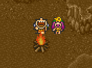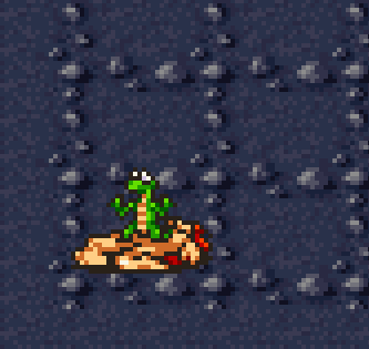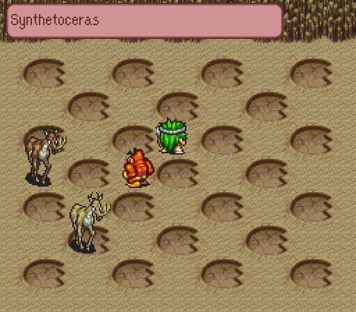 Probably one of the whole game's most interesting character designs: the caveman wearing a figleaf that, on closer inspection, is actually a live lizard that is used for attacks, and which stands up (like a grave flower?) in the defeat sprite.