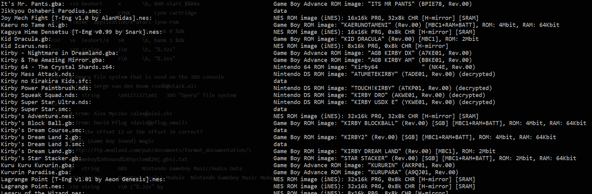 Not sure what's more surprising: that the Unix "file" command can identify ROMs, or that it can seemingly identify ROMs for every Nintendo system EXCEPT the SNES.