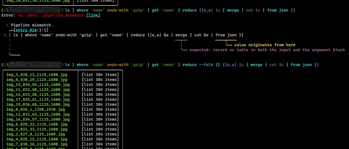 Trying out NuShell (https://www.nushell.sh/). In this screenshot here, I'm merging an undisclosed number of JSON files containing filename-array mappings, that for some reason have an incorrect 'gzip' extension, all without using jq.