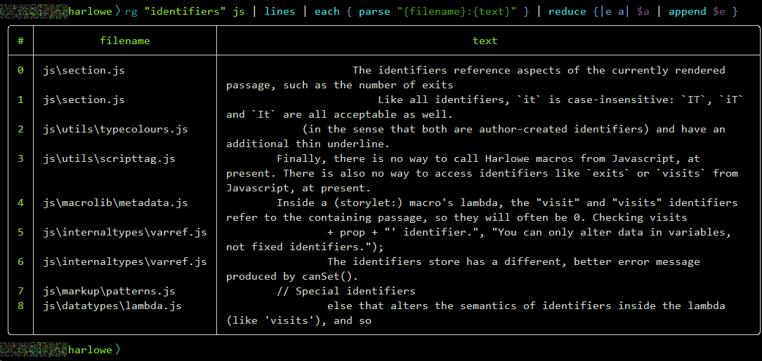 I've been playing with this thing (NuShell) for the whole day… it's still very rough, but I've been able to accomplish so much by just A) studying the way it outputs data structures, and B) assuming all the functional programming verbs work the way I want them to.