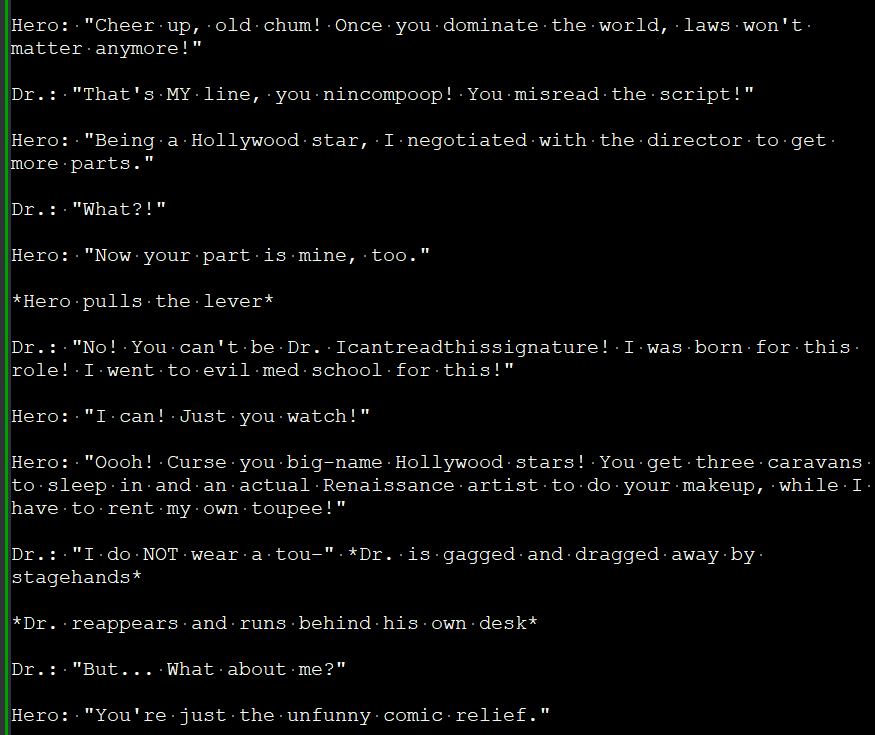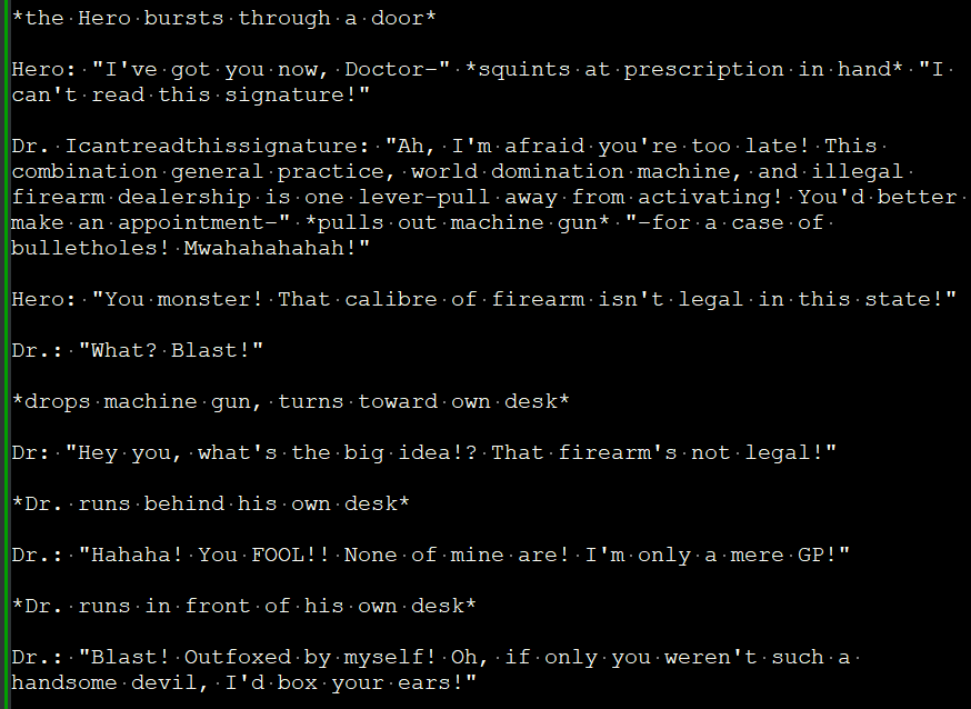 Trying a new kind of writing exercise, where I simply "Write Like A Child Making Up A Story". This whole thing is largely stream-of-consciousness, and I admit I'm a little surprised at how much of this childish Western-cartoon comedy style I can still somehow dredge up.
