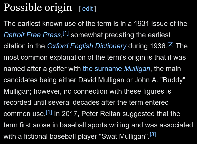 *reading the Wikipedia page about the origin of the term "mulligan"* Well, the first attempted explanation is dubious, but I guess I'll allow them to take a second shot at it