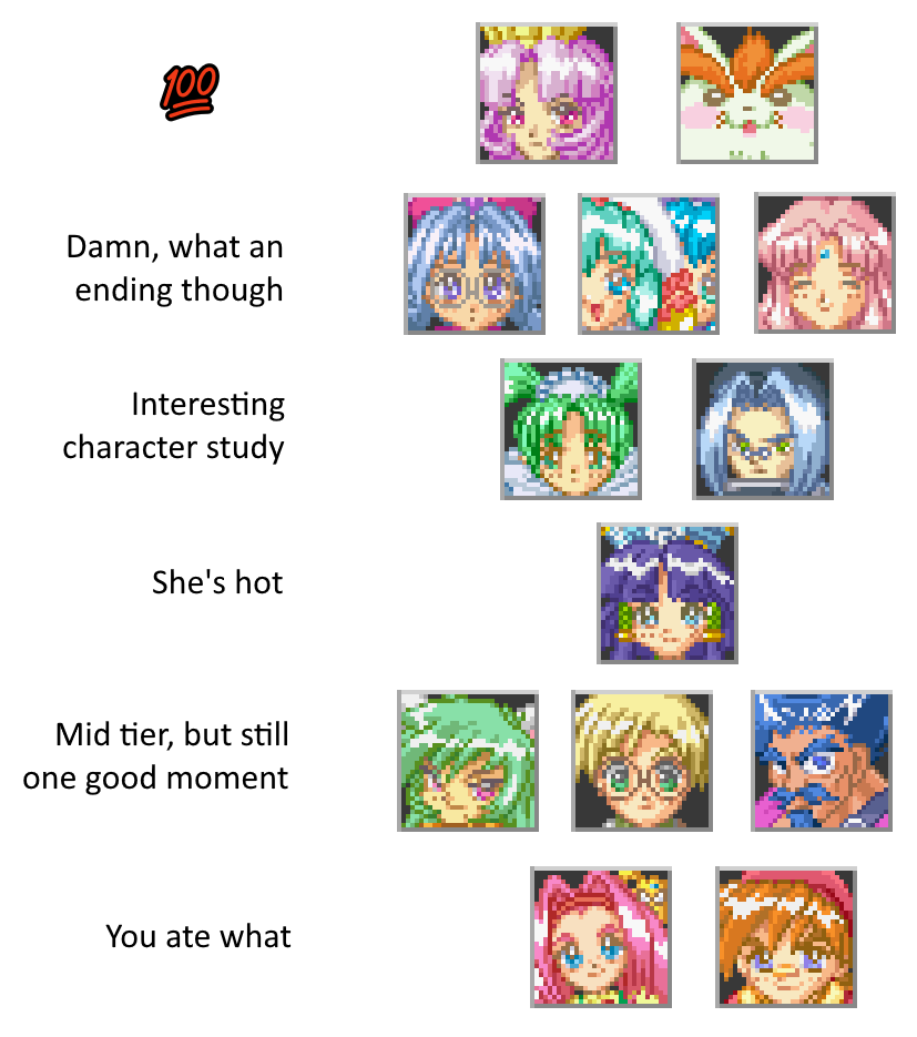 While I understand that Romancing SaGa 2's Seven Heroes's lopsided gender distribution is because they're supposed to be the Seven Lucky Gods (Rocbouquet, the only woman, being Kisshouten, and the feminine Wagnas being Daikokuten) but… I still kinda wish it was a bit different…