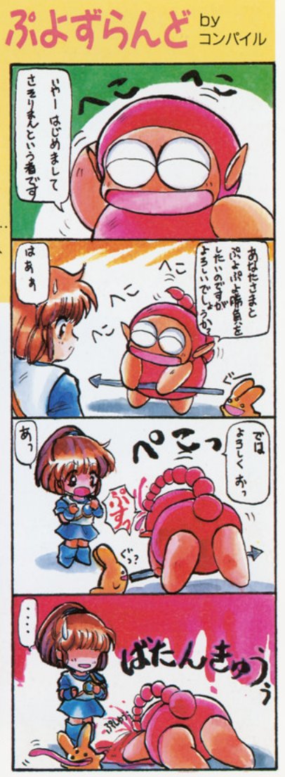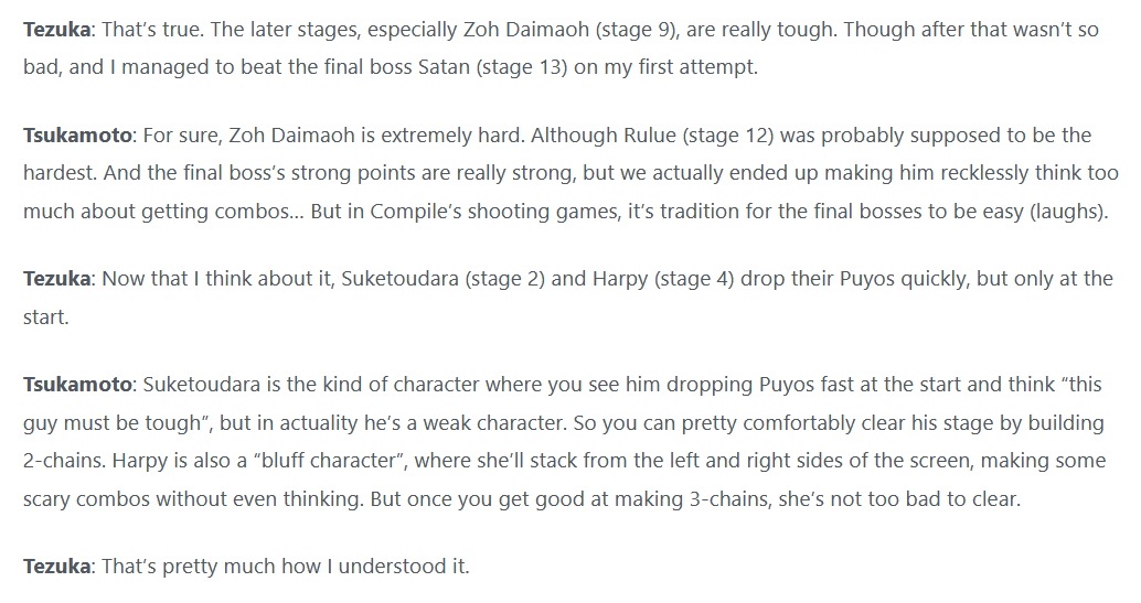 https://itsfantastic.moe/all-about-puyo-puyo-developer-interview/ – Impressed to find a Puyo Puyo 1 developer interview that actually talks about the AI. Glad to see my read that Rulue is better than the end guy seems to actually be correct (though I personally found Minotaurus a bigger hurdle in my attempts…)