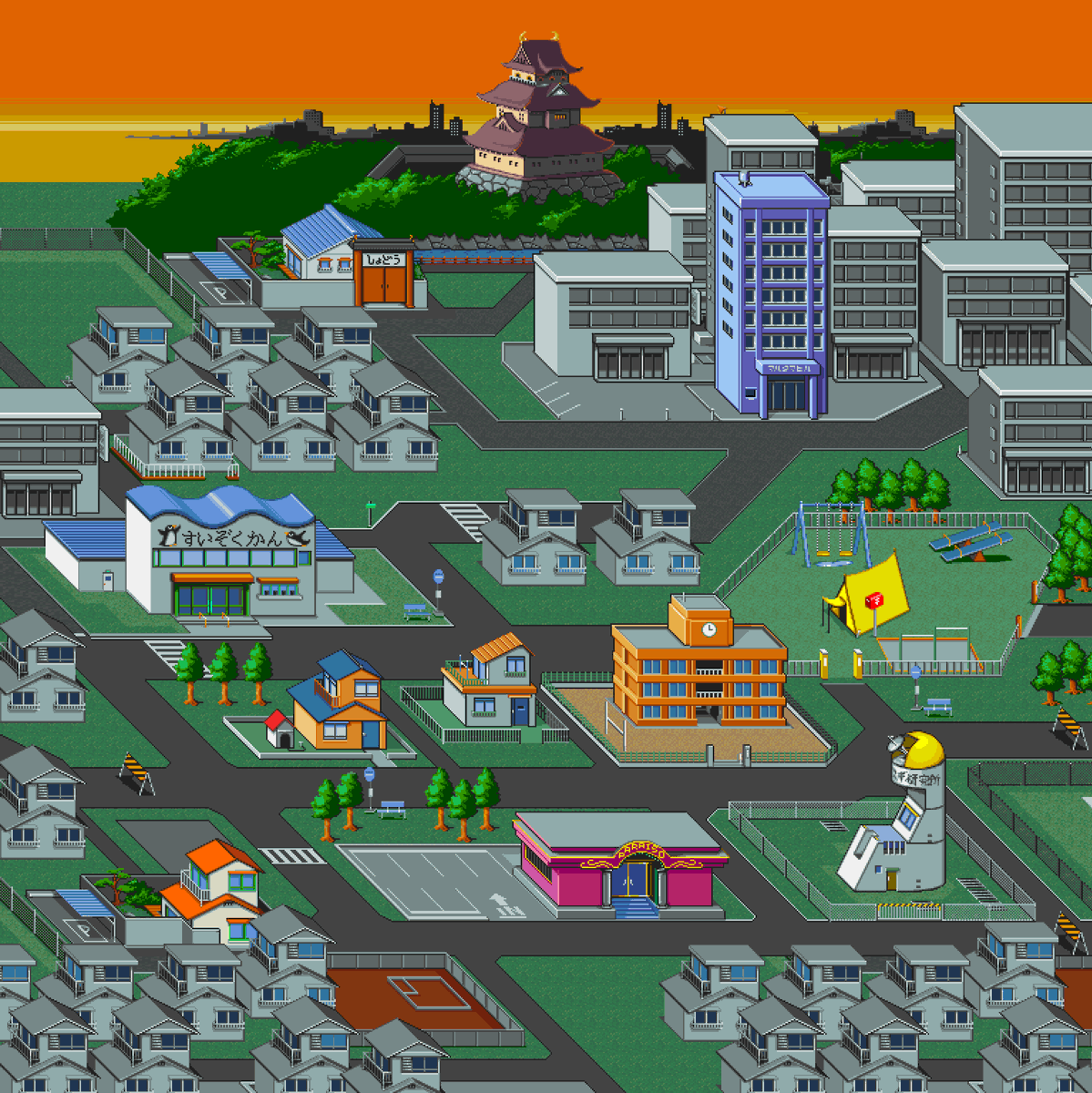Using the F4 key in MAME to extract the full map of Marutama Town from Taisen Puzzle-Dama! This is probably already in VGMaps, but I couldn't resist. Just like true modern-day-RPG towns, it has pleasantly inconsistent building scale AND conspicuously placed roadblocks.