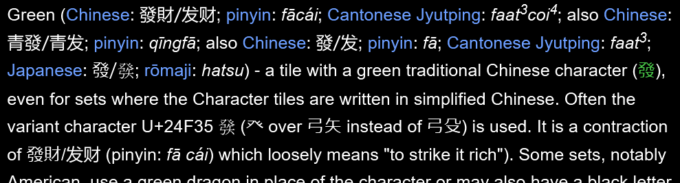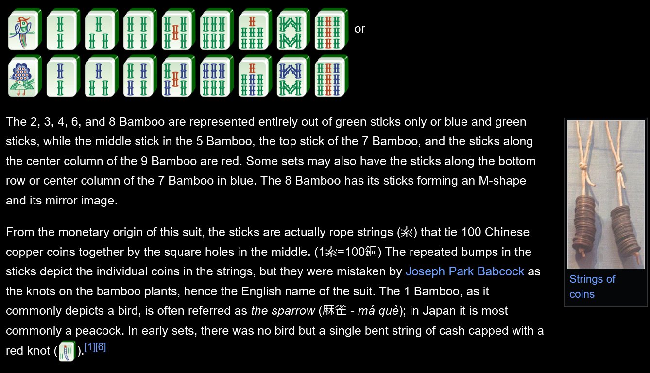 Reading about mahjong on Wikipedia and feeling both annoyed and amused that bad English translations make it appear way more highbrow than it actually is - the symbols are cast as bamboo and dragons, when originally they either meant piles of coins, or increased gambling payouts.