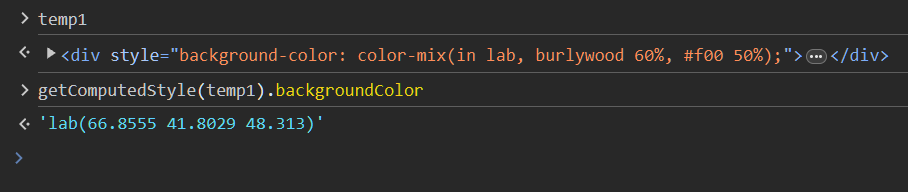 Going into the webdev laboratory (i.e. pressed F12) to see how color-mix() in CSS works with getComputedStyle(). Can it simply get you the fully computed colour? It seems: yes, it can! But it's in the format of the color model you mixed with.