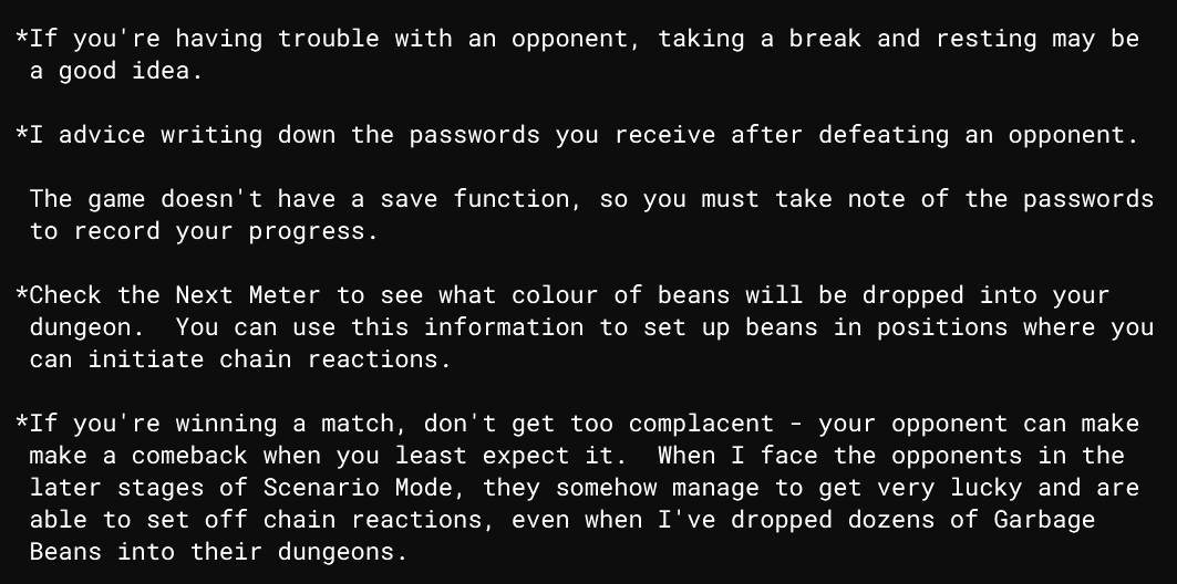 The Puyo Puyo 1 Mega Drive manual is kind of incredible: it states that Arle is forced to unseal an ancient forbidden spell that can imprison monsters in a rift in spacetime, but it only works if the monsters are the same colour and in groups of four or more?
