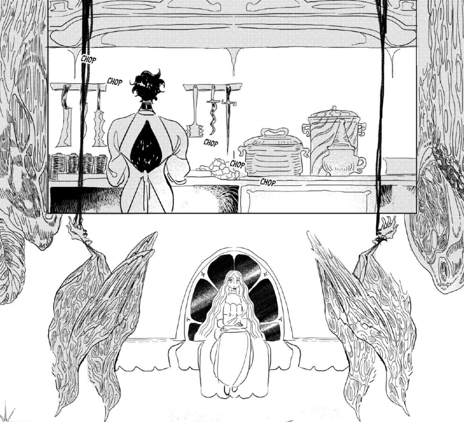 It All Ends With Me (https://www.shortboxcomicsfair.com/shop/p/3s20hekys42i0gddv2evzskqfbuubx) – A cold, tense fairytale comic with great linework and character design, juxtaposing sumptuous architecture and dress with the gruesomeness of meat.