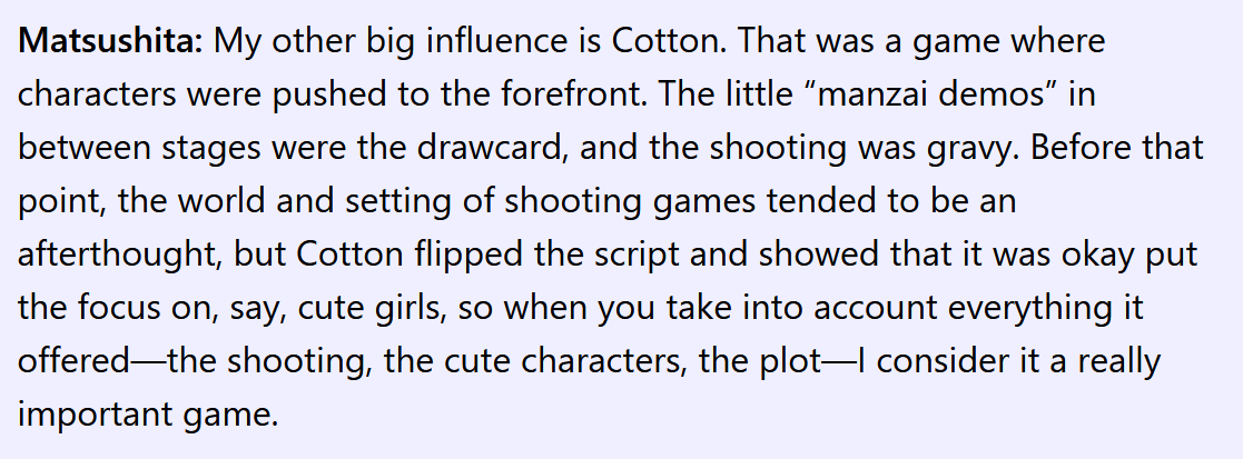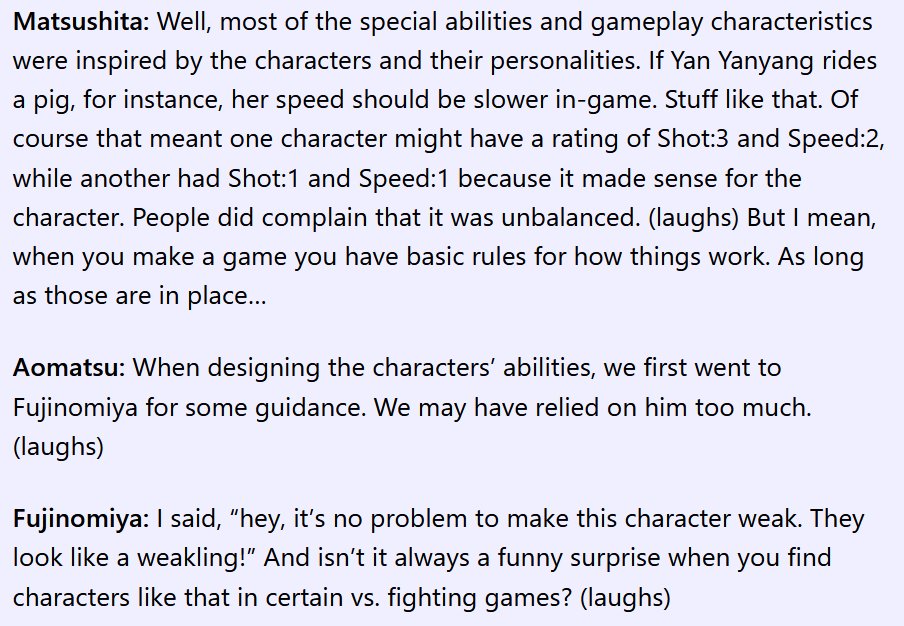 https://shmuplations.com/twinklestarsprites/ – Reading this interview… These peoples' low opinions of versus game balance as a design goal is impressively refreshing. (← Not necessarily a tone of agreement)